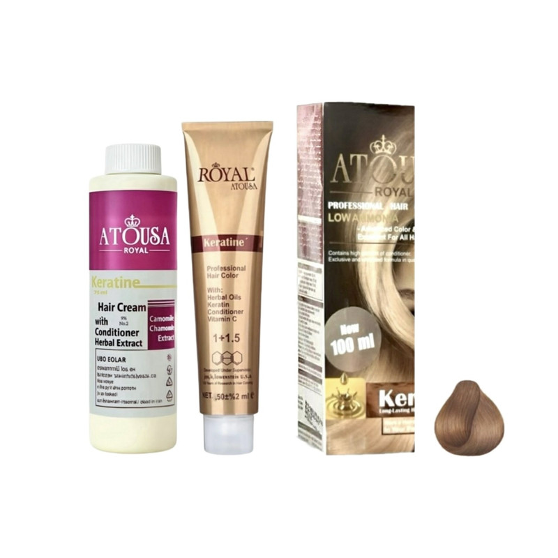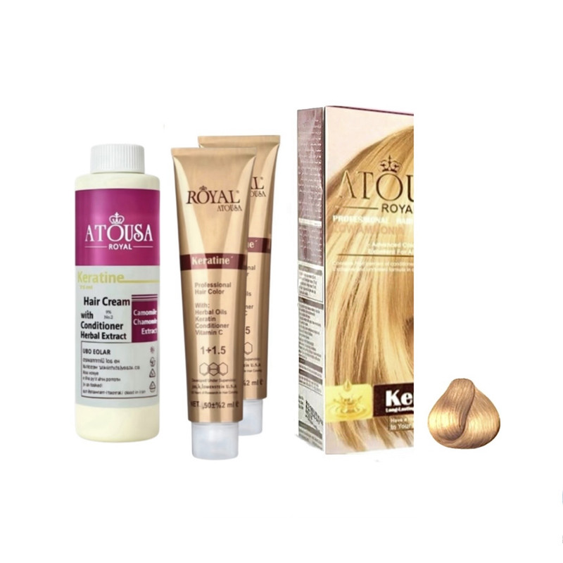 رنگ مو آتوسا رویال شمار 8.5-G7 حجم 50 میلی لیتر رنگ بلوند طلایی روشن به همراه اکسیدان آتوسا رویال مدل 2 نه درصدی حجم 75 میلی لیتر بسته 3 عددی
