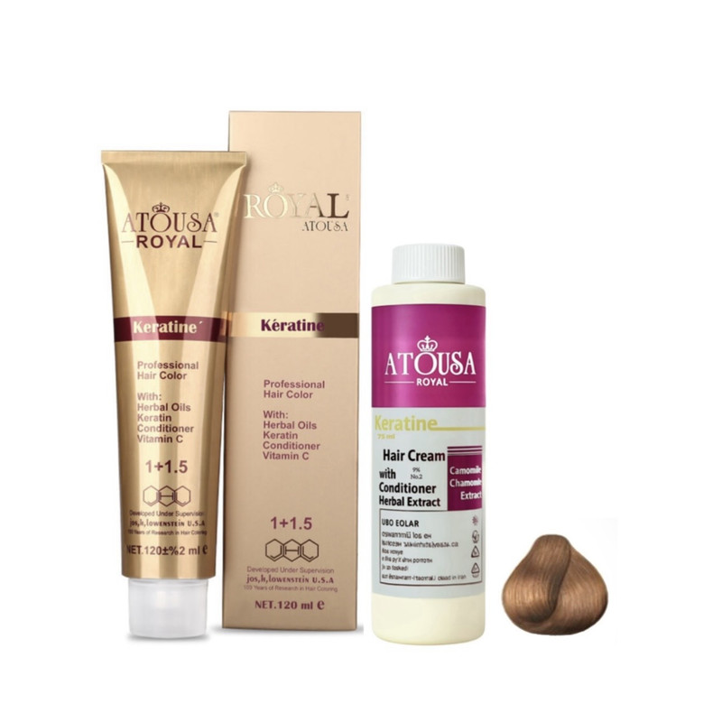 رنگ مو آتوسا رویال شماره N7_8.0 حجم 50 میلی لیتر رنگ بلوند روشن بسته دو عددی به همراه اکسیدان آتوسا رویال مدل 2 نه درصدی حجم 75 میلی لیتر