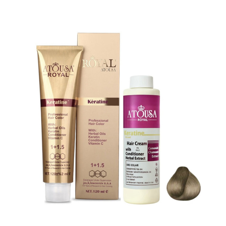 رنگ مو آتوسا رویال شماره 5.3_M4 حجم 120 میلی لیتر رنگ قهوه ای زیتونی روشن به همراه اکسیدان آتوسا رویال مدل 2 نه درصدی حجم 75 میلی لیتر