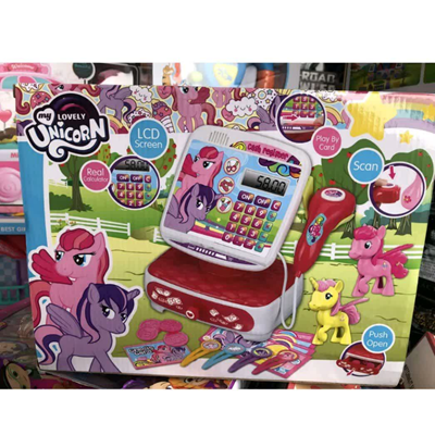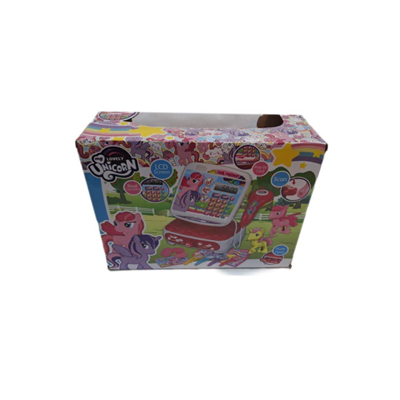 صندوق فروشگاهی طرح پونی همراه خود علاوه بر 2 عدد فیگور 10 سانتی پونی به رنگ زرد و صورتی ، اسکناس های طرح پونی هم دارد که این مجموعه را جذابتر کرده است . صفحه صندوق ، حالت ماشین حساب دارد که دارای دکمه on/off می باشد که با روشن کردن دکمه هنگام کارت کشیدن صدا پخش می شود .